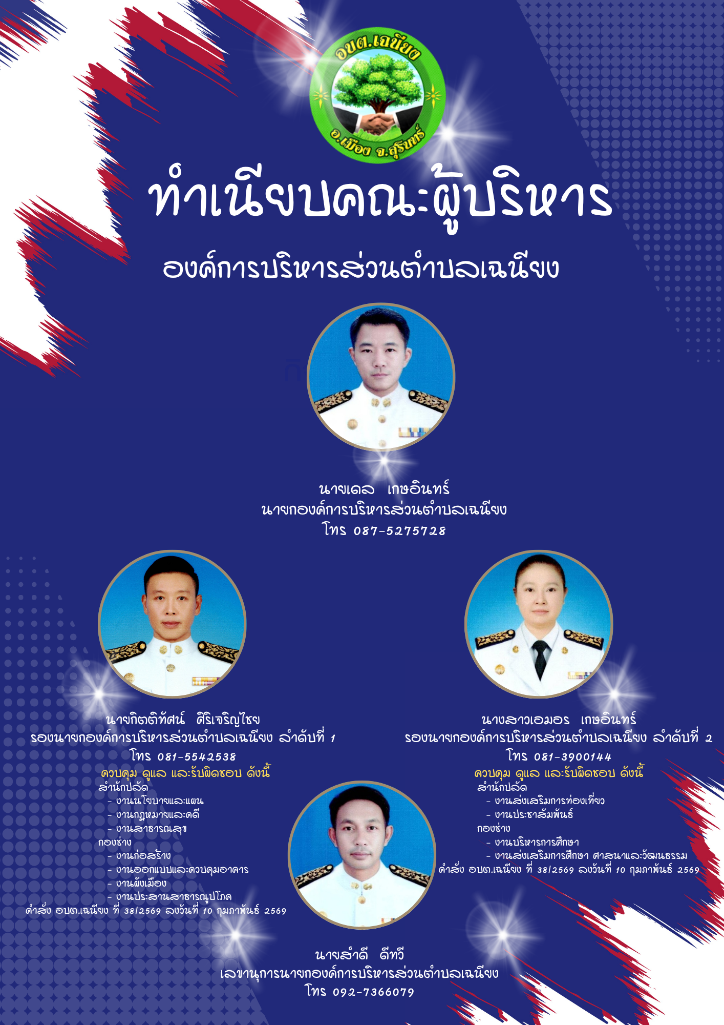 ทำเนียบคณะผู้บริหาร นางวิไลพร วิชัย ปลัดองค์การบริหารส่วนตำบลเฉนียง หมายเลขโทรศัพท์ 088 5909735 นายอิศรานุวัฒน์ เทียนแก้ว รองปลัดองค์การบริหารส่วนตำบลเฉนียง หมายเลขโทรศัพท์ 061 5398253