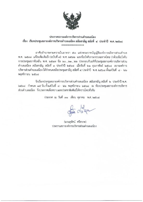 ประกาศสภา อบต.เฉนียง เรียกประชุมสภา อบต.เฉนียง สมัยสามัญ สมัยที่4 ประจำปี2568